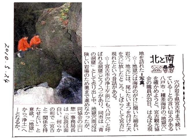 浄土ヶ浜観光船発着所裏に「八戸穴」があります。現在では観光面で「青の洞窟」という名前で売り出しています。この「八戸穴」、文久2年(1862)江刺恒久が著した「奥々風土記巻5」にこの穴が八戸に通じ「八戸の某海にも宮古窟といふあり」ということから、八戸市の市史編纂室に問い合わせたところ八戸キャニオンの中に「閉伊窟」という洞窟があったが鉱石の採掘よって(露天堀りのため)無くなったとのことでした。伝説の出口が無くなりあきらめていたところ種差観光協会の会長さんから電話があり、「うちの種差海岸に地獄穴という洞窟があるがこれが宮古に繋がっているという伝説があります」との電話がありました。そのうち視察にまいりますということでお話をして、「しかし会長さん、種差から宮古に来るときは地獄から浄土でいいですけどその逆はいやですね。」「ハハハハっそうですね」と笑っておられました。その時の新聞の記事をご覧ください。