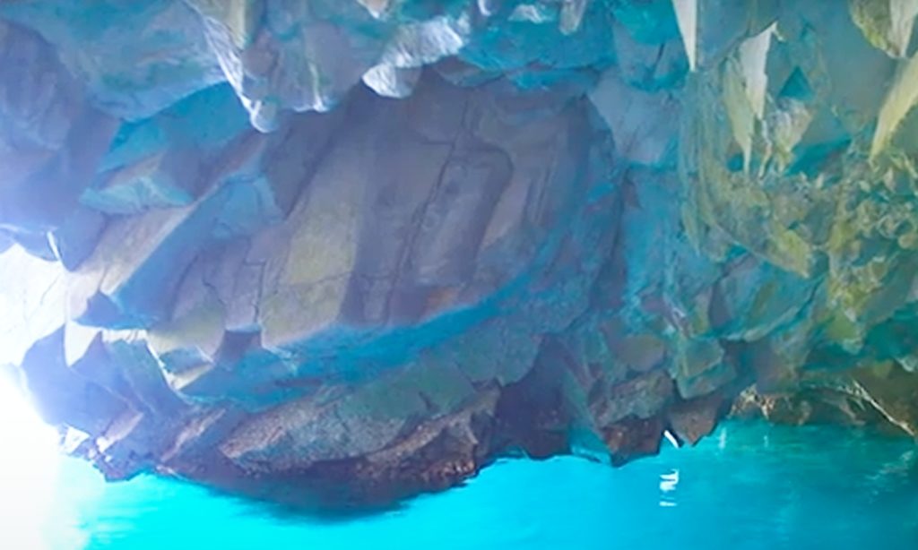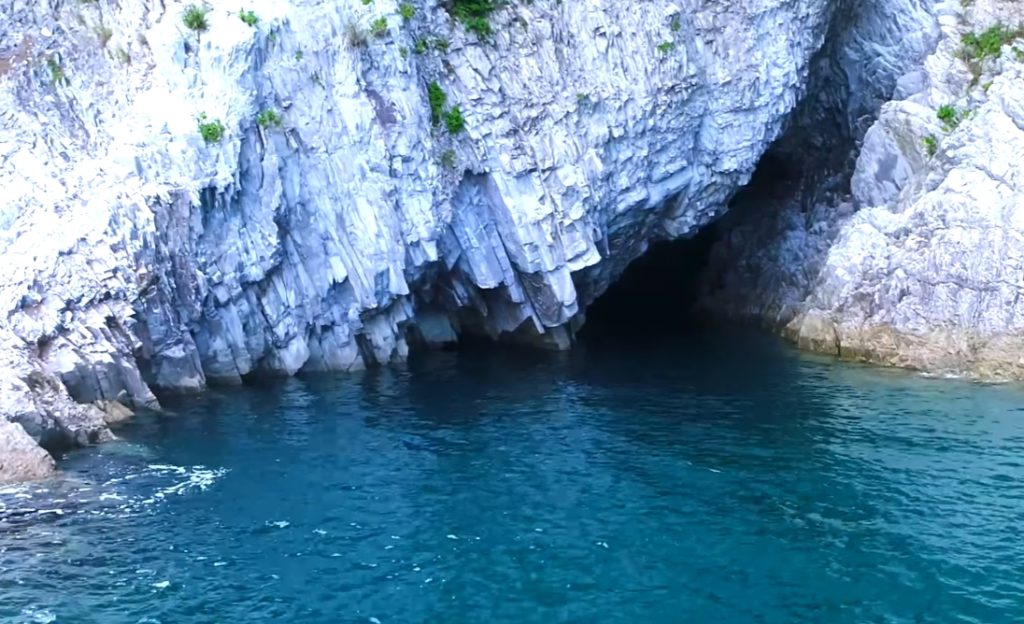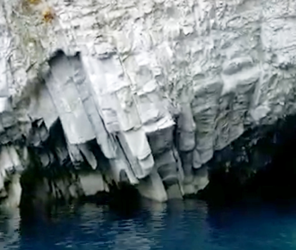 管理人が選ぶ浄土ヶ浜の美しい節理、第2弾は「青の洞窟」を挙げたいと思います。その理由ですが外海に近く、激しい浸食に耐えながらその美しさを保っているということです。外側、内側とも見事な造形です。特に洞窟内部は白い節理面がエメラルドグリーンに染まります。海面から岩肌への光の反射の美しさに感動することでしょう。